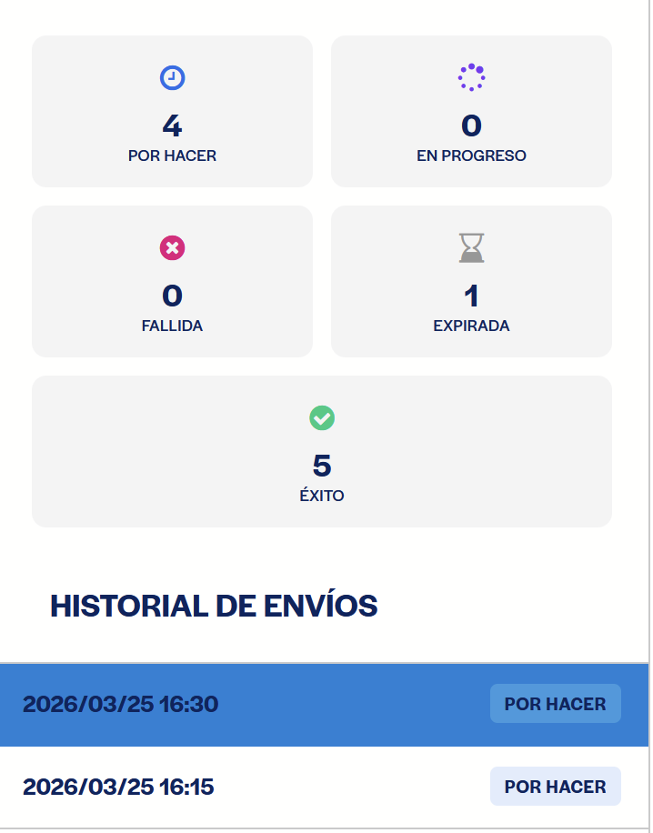 Debajo del resumen, se presenta un listado cronológico de cada instancia generada según la frecuencia programada. Cada registro muestra la fecha, hora y su estado actual (ej. "POR HACER", "EXPIRADA", "ÉXITO").