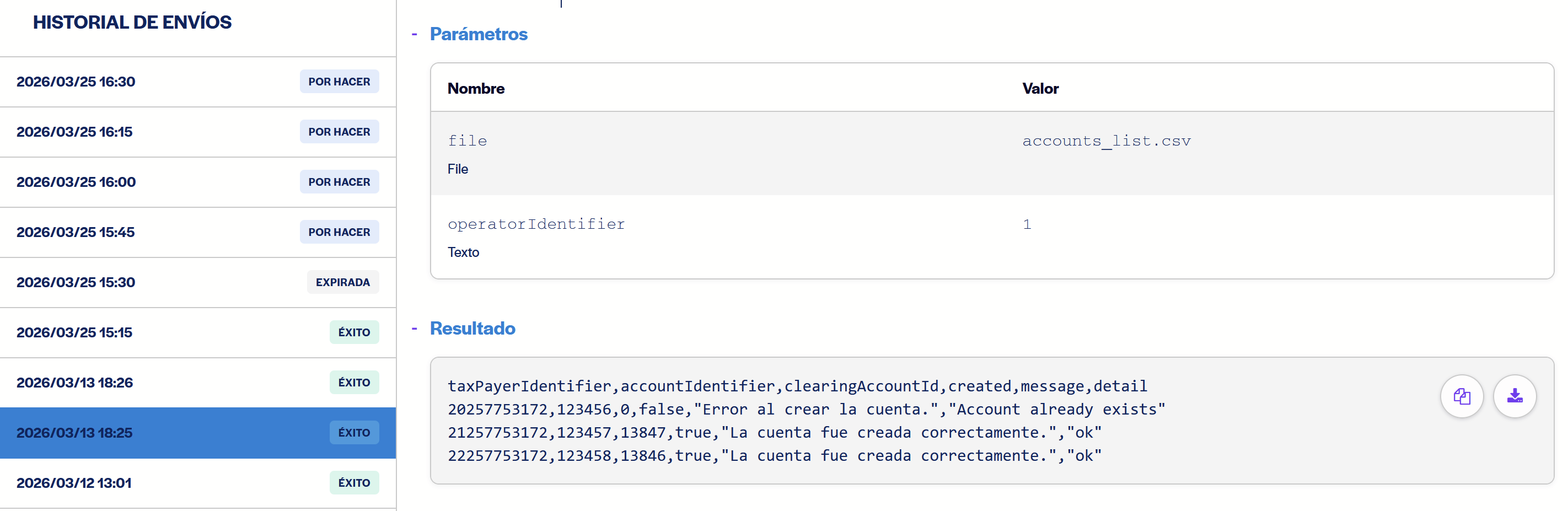 Parámetros: Sección donde el usuario debe completar los datos adicionales requeridos por el método de la API (por ejemplo, el campo operatorIdentifier). Estos pueden ser campos obligatorios marcados con un asterisco.