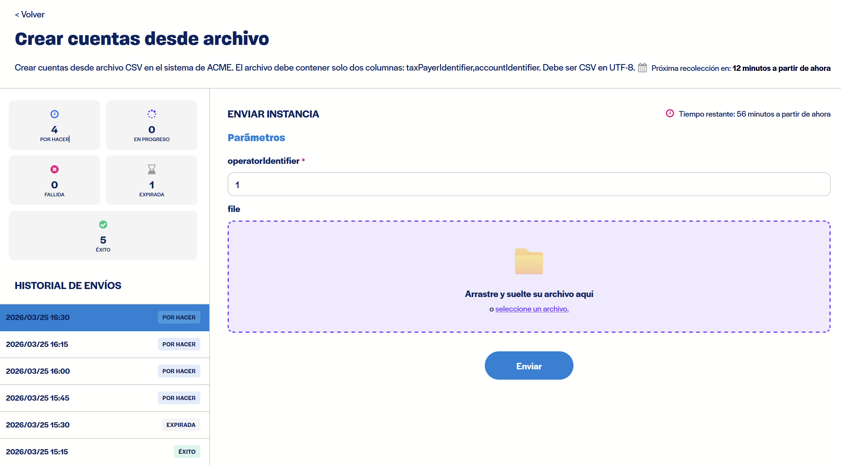 Carga de Archivo (Parámetro file): * Área de Drag & Drop para subir el archivo (ej. un CSV en formato UTF-8).